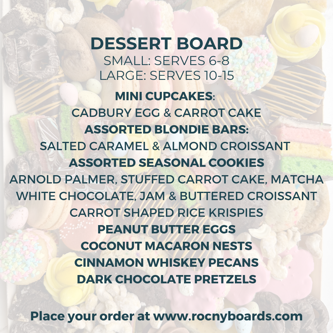 Easter Menu Pick Up or Delivery Available on 4/4 & 4/5 | While Spots Last! CHARCUTERIE BOARD MENU BRUNCH BOARD MENU DESSERT BOARD MENU